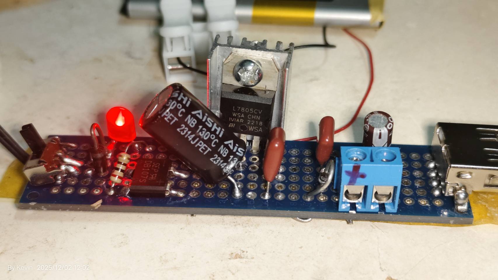 經整流濾波為接近15V DC後, 進入L7805, 降壓穩壓為5V輸出,即可供標準USB輸出使用.