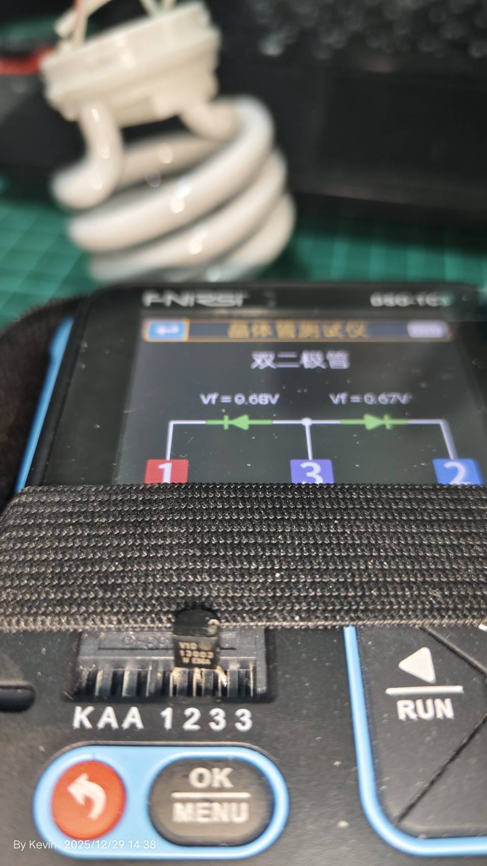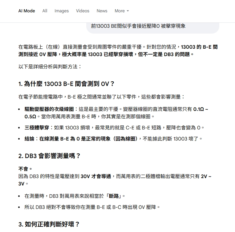 本來以為它是炸了一路, 結果呢, 拆下13003 我那LCR測不出標準NPN沒錯, 但因為它有限制, 比如放大倍數超過600之類的它測不出, 畢竟是個迷你家用的,但電表量測NPN的压降是正常的, 原因呢, 是受電路影响, 因為它有和電感相接地方, 導致我線上測BE間压降近乎零, 受到干擾…所以我就決定先把坏的都換了.