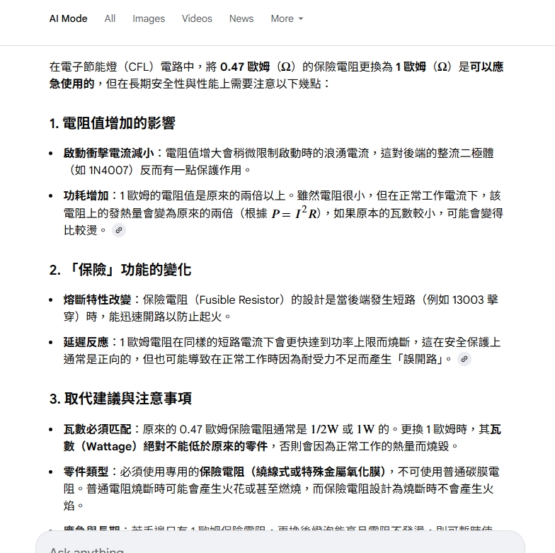 (PS: 因為它看起來像碳膜電阻,不過它確實雖然開路, 但沒燒焦的痕跡, 姑且當它是專用保險用的繞線式電阻吧)