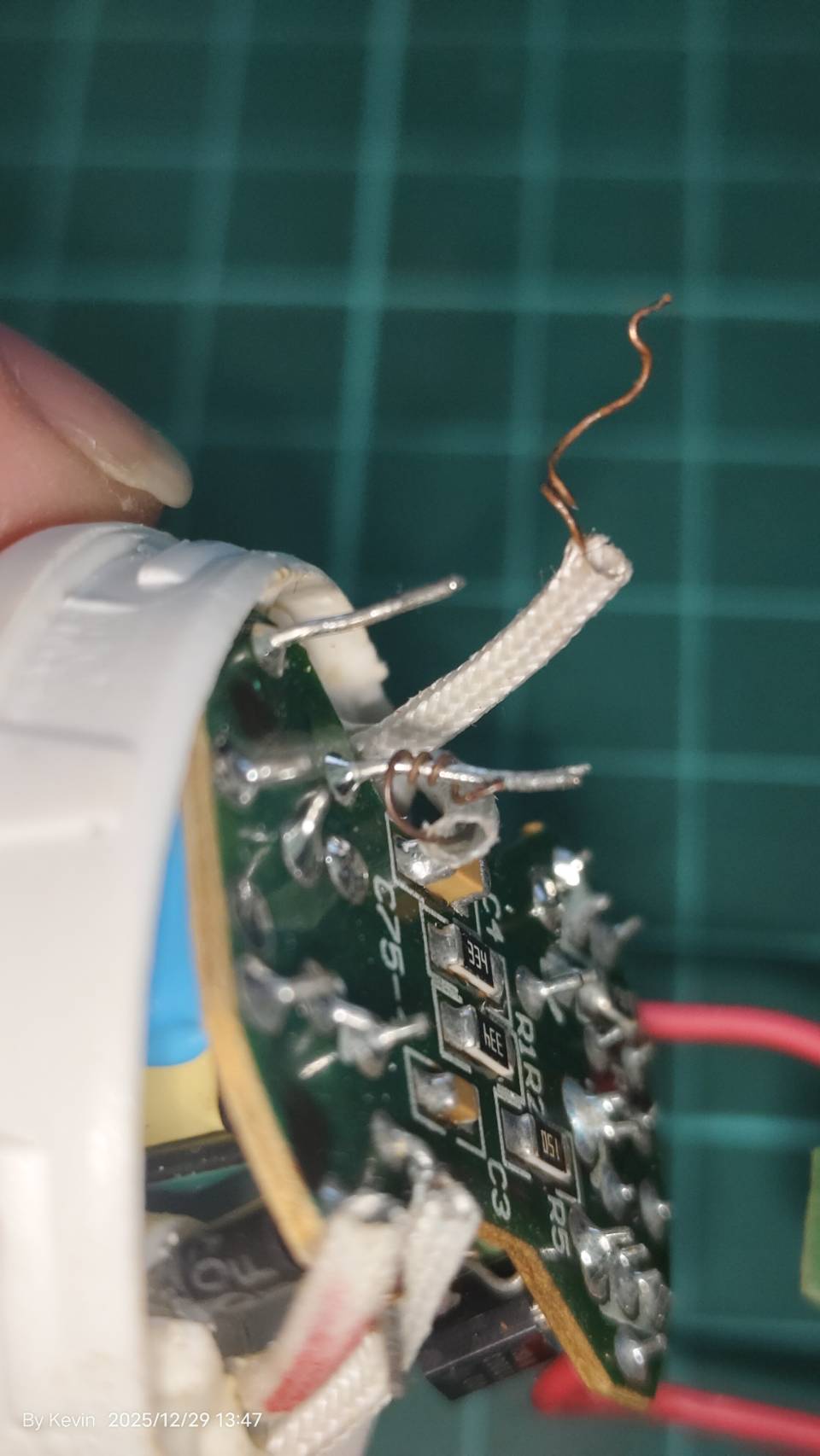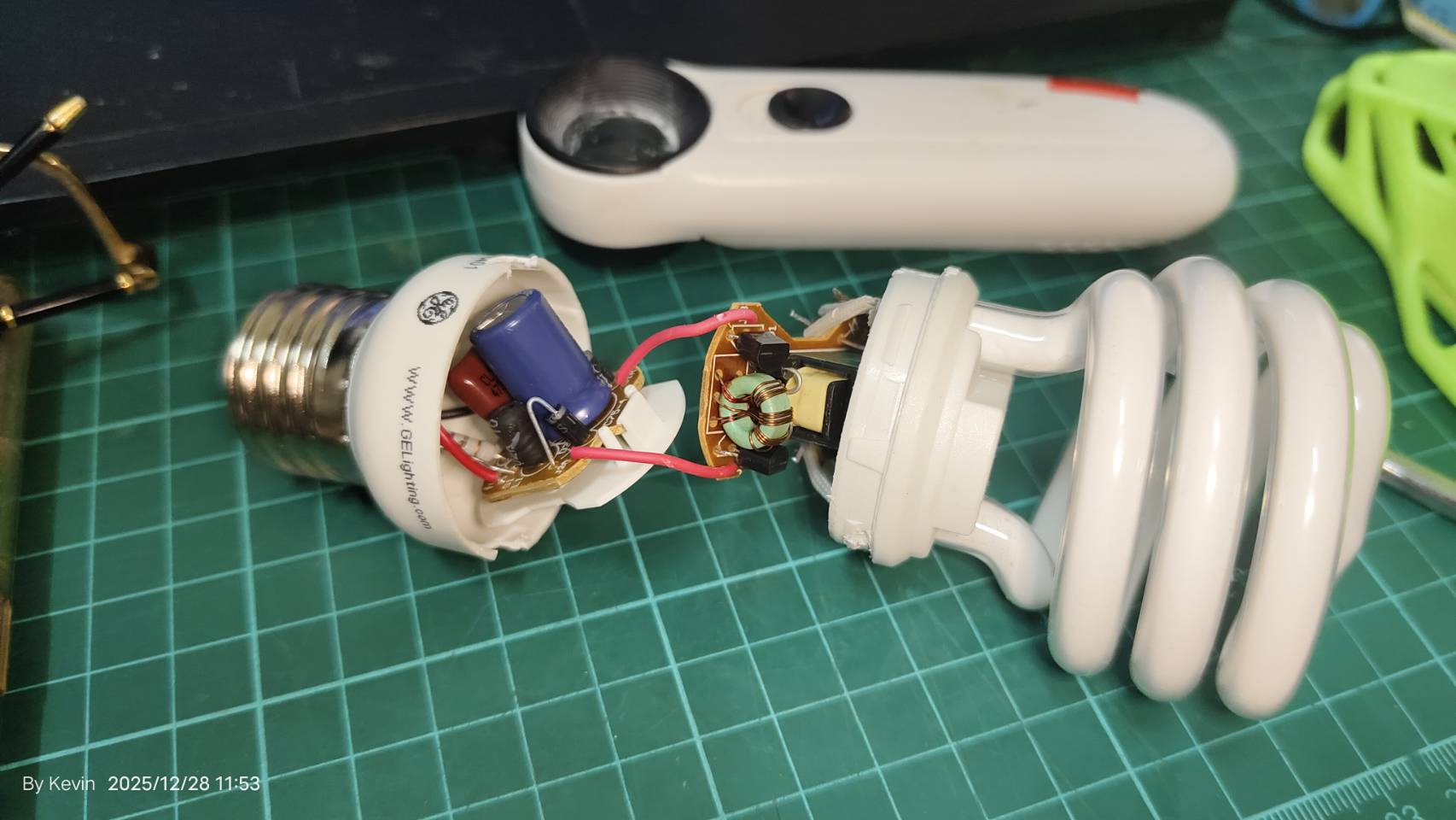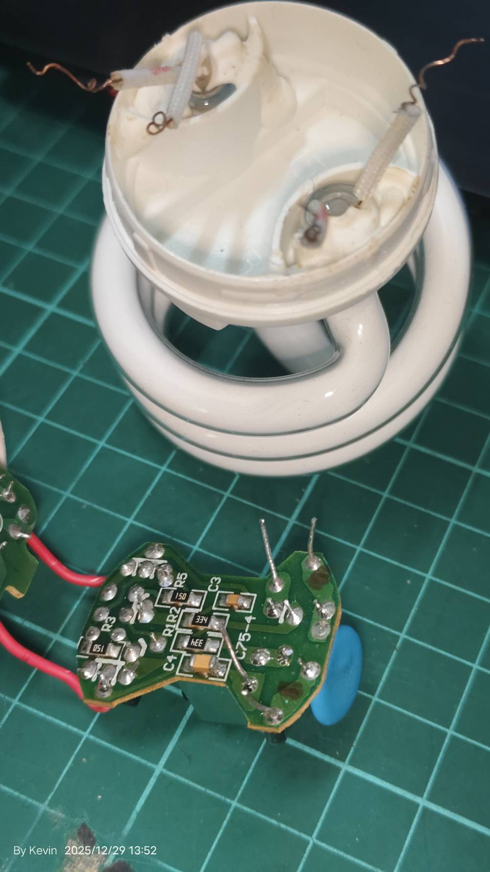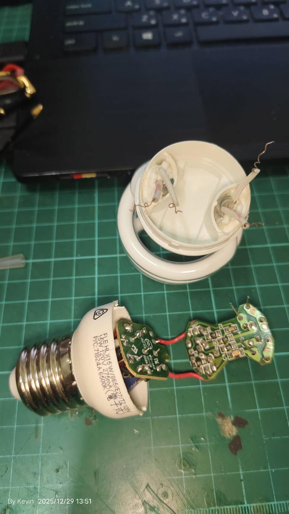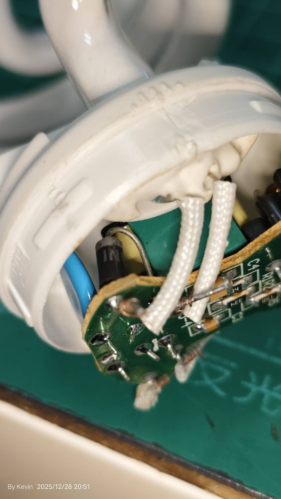 昨天發現家里老式節能燈掛了…初步線上電路元件檢測還以為炸了一片…初級兩支整流二极管,保險電阻, 次級兩支13003, 及兩支整流二极管..
