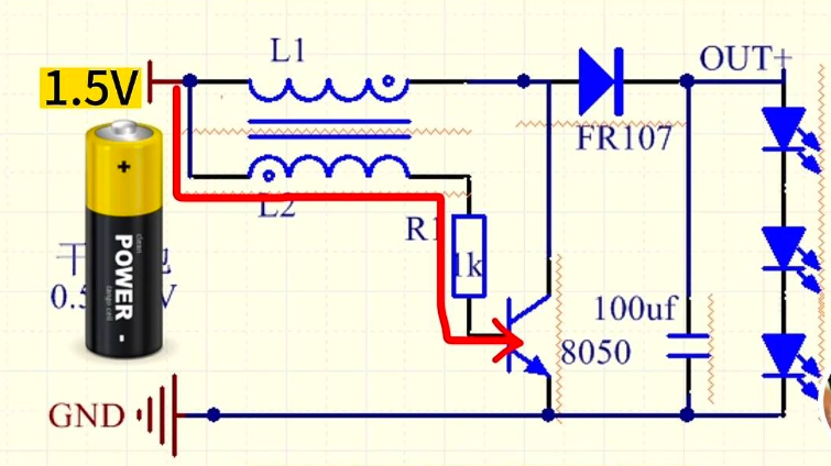 然後我想到用之前做的焦耳小偷電路來驗證, 看同名端對不對, 因為這個電路也需要確認同名端來使用, 下面电路图中, L1 L2 線圈上有標小圈圈即是同名端.