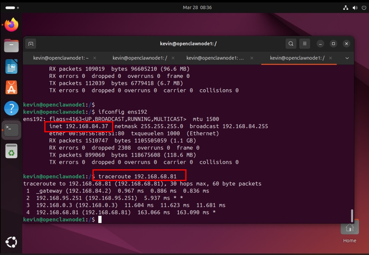 以下截圖是我異地遠端的LINUX主機, 它主要做為龍蝦的節點使用, IP: 192.168.84.37, 做了到192.168.68.81 的traceroute, 可以看到經過4個節點, OPENVPN建在95.251與0.3之間, 0.3及68.81 在我家, 前兩個是異地遠端的gateway.