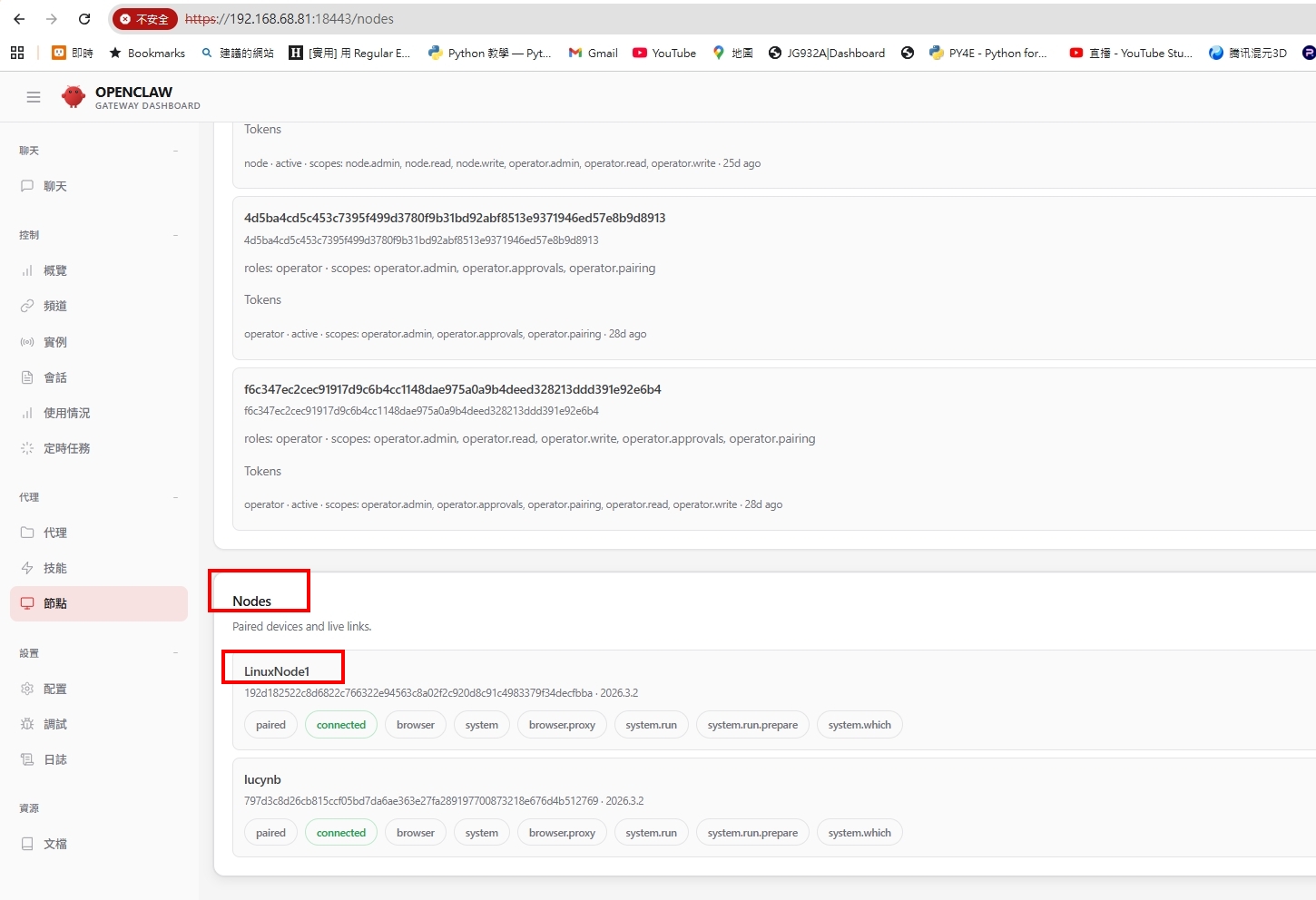 可以在龍蝦管理界面上看到節點已抓到, 在龍蝦的架構中, gateway是指揮中心, 你可以說它是大腦, 而節點就是AI的手和腳.可以做事的手腳.