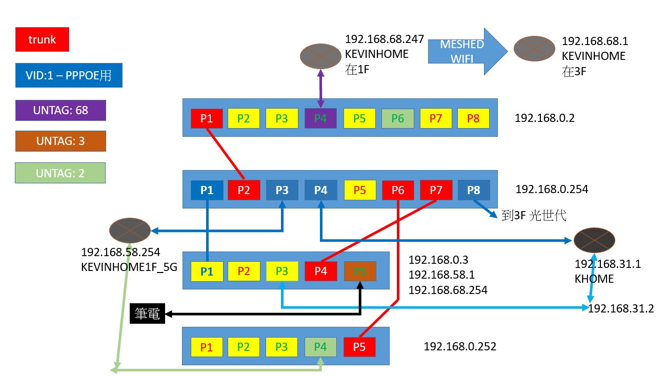 以下是我家中網路架構的示意圖… 我家主要的三段網段, 192.168.0.0/24, 192.168.58.0/24, 192.168.68.0/24, SWITCH間與ROUTER間走VLAN TAGGING, 實際192.168.68.0/24 這段是透过一組四顆WIFI AP組成的MESHED WIFI NETWORK. 在1F的AP上, 在它的LAN PORT接入UNTAG VLAN ID: 68, 接入MIKROTIK ROUTEROS的192.168.68.254/192.168.0.3那顆, 而它與異地間有SITE-TO-SITE OPENVPN的TUNNEL. 必須在上面設定好SNAT, 才可使遠端透过它連入我在68網段的龍蝦手机.