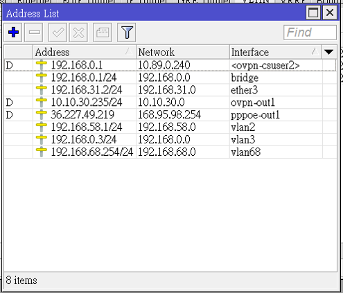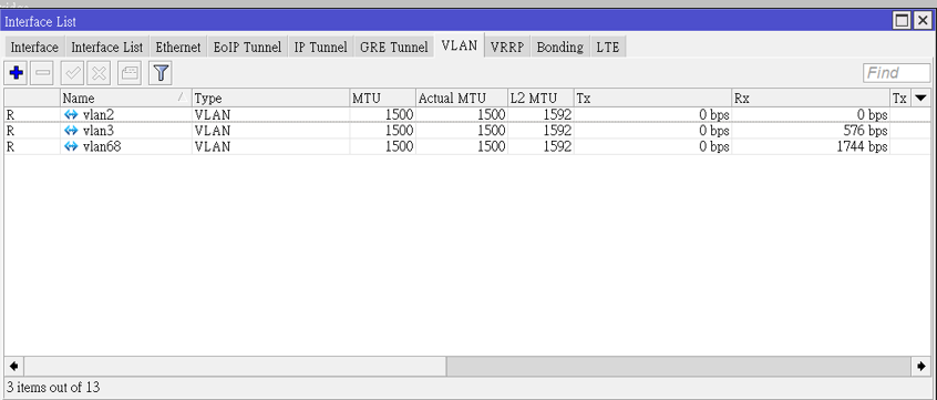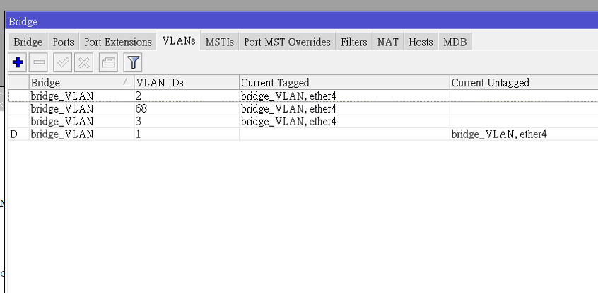 我建議呢, 新起一個bridge界面來整合VLAN 配置..以我個人應用來說呢, 我家中有三段VLAN, 分別為vlan2 vlan3 vlan68. 在三台switch中做vlan trunk. vlan id 分別是2, 3, 68. 以下分享標準的mikrotik 整合VLAN trunk的設定方法, 這樣獨立設置出來,可避免在設定VLAN期間,與管理界面失联或在設定失敗時, 完全連不上管理IP, 那時就得又RESET重來.