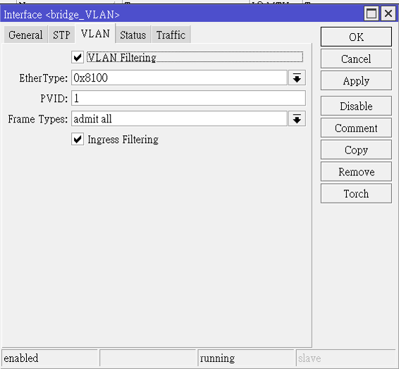 7. 以上配置完了, 基本完成了與SWITCH做VLAN TRUNK的準備,只差最後一步..打開bridge_VLAN,找到VLAN 這一分頁, 啟用VLAN_Filtering, 這一動作打開才完成vlan trunking